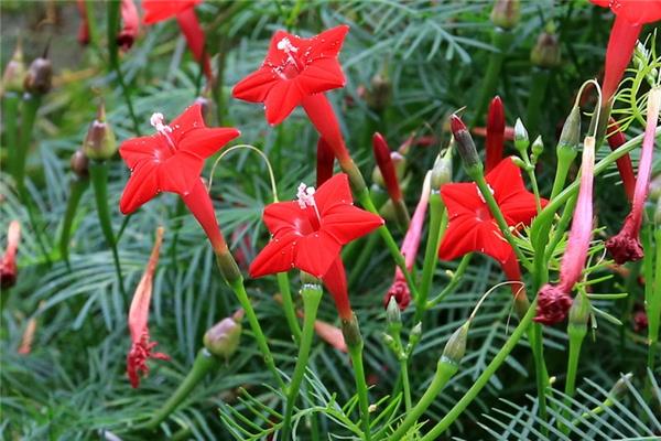 Annual frail twining herbs, glabrous. Leaves ovate or oblong, long 2~10cm, broad 1~6cm, simple leaves alternate, leaf lobes slender as silk, pinnately parted to midvein, with 10-18 pairs of linear to filiform spreading lobes, lobe apex acute; petiole long 8~40mm, base often with pseudostipules. Inflorescences axillary, composed of a few flowers Cymes; total pedicel mostly exceeding leaves, long 1.5~10cm, flowers erect, pedicel longer than calyx, long 9~20mm, thickened into rod in fruit; sepals green, slightly unequal, elliptic to oblong spoon-shaped, outer one slightly shorter, ca. 5mm, apex obtuse and with small protuberance. Corolla salverform, ca. 2.5cm long, crimson, glabrous, tube weak, distally slightly inflated, limb spreading, ca. 1.7 cm in diam. 2 cm in diam. On several Wuxiang star-shaped flowers, the color is deep red and bright, in addition to red, there are also white. Capsule ovate, 7-8 mm long, 4-loculed, 4-valved, septum persistent, transparent. Seeds 4, ovate-oblong, 5-6 mm long, dark brown. The flowering period is from early July to late September, one batch opens every day, and wilts in the morning and afternoon.
